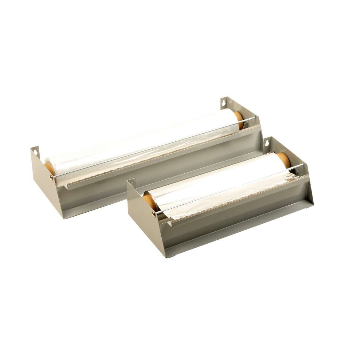 Kovinsko stojalo za alufolijo in oprijemljivo folijo širine 45 cm, primerno za montažo na steno ali kot namizno držalo.