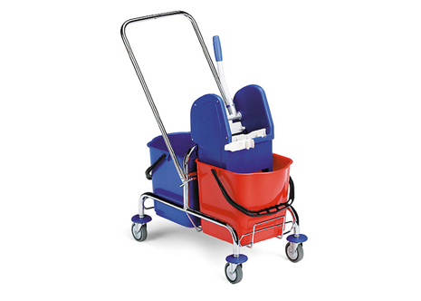 Voziček JACK Filmop z dvema 15 l vedroma (modro in rdeče), potisnim ožemalnikom, U ročajem in kovinskim ogrodjem na kolesih fi 80 mm.